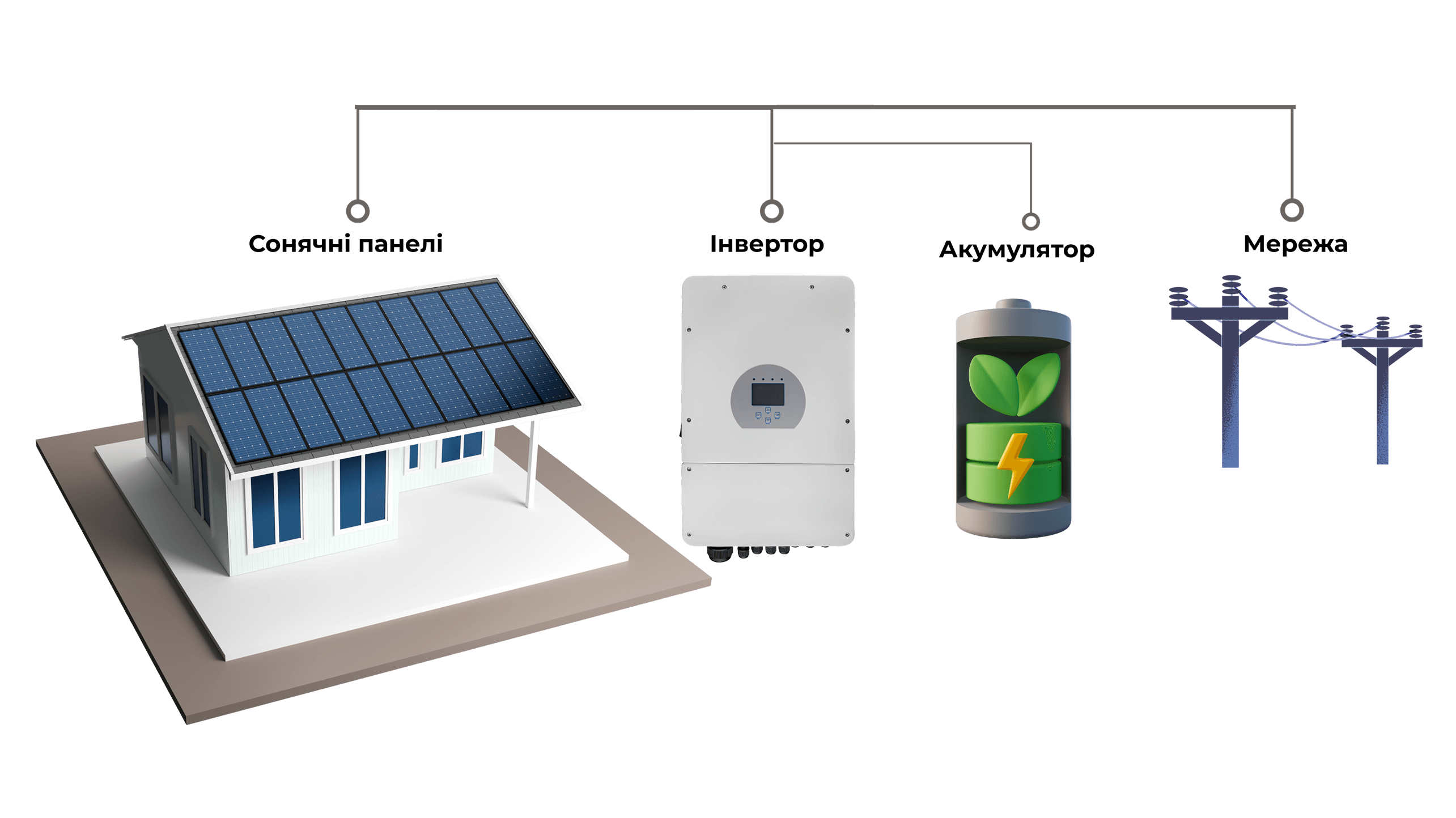 Принцип роботи: Поєднує можливості мережевої та автономної станції – працює з мережею, але також має акумулятори для збереження енергії.